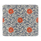 Seamless floral pattern with vibrant orange flowers and navy blue leaves on a beige background, creating an ornate, symmetrical design.