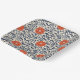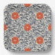 Seamless floral pattern with vibrant orange flowers and navy blue leaves on a beige background, creating an ornate, symmetrical design.