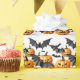 This Halloween-themed pattern features smiling pumpkins, flying witches on broomsticks, black cats, bats, and full moons. Against a light background, these festive elements create a playful and seasonal design. Perfect for spooky crafts or decorations!