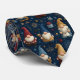 This whimsical, seamless pattern features a collection of chubby holiday gnomes in red, blue, and gold hats. The gnomes are interspersed with festive elements like fireworks and wrapped gift boxes. Set against a dark navy blue background.