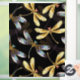Seamless pattern with gold, jewellery, shiny dragonflies with detailed, sparkling wings on black background. Gold dragonfly.