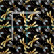 Seamless pattern with gold, jewellery, shiny dragonflies with detailed, sparkling wings on black background. Gold dragonfly.