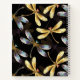 Seamless pattern with gold, jewellery, shiny dragonflies with detailed, sparkling wings on black background. Gold dragonfly.