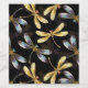 Seamless pattern with gold, jewellery, shiny dragonflies with detailed, sparkling wings on black background. Gold dragonfly.