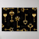 Seamless pattern of antique, gold and silhouette keys on black background.