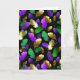 Seamless pattern of bright purple, green, and gold feathers on black Mardi Gras background. Design for the Mardi Gras holiday.