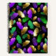 Seamless pattern of bright purple, green, and gold feathers on black Mardi Gras background. Design for the Mardi Gras holiday.
