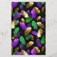 Seamless pattern of bright purple, green, and gold feathers on black Mardi Gras background. Design for the Mardi Gras holiday.