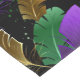 Seamless pattern of bright purple, green, and gold feathers on black Mardi Gras background. Design for the Mardi Gras holiday.