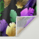 Seamless pattern of bright purple, green, and gold feathers on black Mardi Gras background. Design for the Mardi Gras holiday.