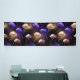 Seamless pattern of bright, golden, purple, artistically drawn, glowing jellyfish on black sea background. Glowing jellyfish.