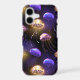 Seamless pattern of bright, golden, purple, artistically drawn, glowing jellyfish on black sea background. Glowing jellyfish.