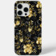 Seamless pattern with black and gold blooming orchids, richly decorated with black eucalyptus twigs and delicate jewellery pistachio twigs on black background. Golden jewellery Orchid.