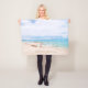 "Seas And Greeting" saying in sandy beach. Captivating beached fishing boat on beach with watercolor aqua blue ocean, and sunny sky above.
