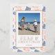 Seas & Greetings Photo Real Rose Gold Foil Holiday Card family photo and Seas & Greetings real rose gold foil card with watercolor seashells in blue and blush pattern background. Beach themed holiday photo cards.