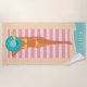 Super cute and fun beach beauty babe resting on a pink stripe towel sunbathing on the sandy beach next to the water. "Seas The Day" is uniquely incorporated around the beach babe's sun hat. You can change this phrase/text to whatever you like. Personalize with your name along the bottom of the towel. Artwork by Moodthology.