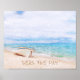 "Seas the Day" typography written quote in the sand of this captivating scene of a beached fishing boat on a sandy beach with watercolor aqua blue ocean,and sunny sky above.