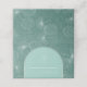 White line art illustration of palm leaves pattern over aqua green background with white text and seashell design over aqua arch with tan border.