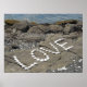 A beautiful setting on the ocean. The word love spelled out using white seashells gathered at the beach.