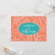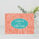 Teacher welcome to class cards with custom message to students. Coral orange and teal blue colours with seashell art pattern on both sides. Customise text on front with welcome to [any grade]. On the back, create a message with helpful school, or class, information, or tell students a bit about you as their teacher.