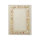 A border of sea shells on beach sand. Inside the border, the beach sand is faded, to allow for easier writing.