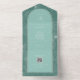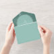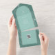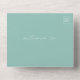 White line art illustration of palm leaves pattern over aqua background with white text and seashell design over aqua arch with tan border. Outside is pink with return address and palm leaf illustration on flap. Rsvp features qr code.