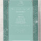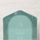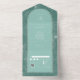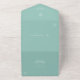 White line art illustration of palm leaves pattern over aqua green background with white text and seashell design over aqua arch with tan border. Outside is aqua with return address and palm leaf illustration on flap. Rsvp features qr code and traditional format.