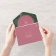 White line art illustration of palm leaves pattern over dark green background with white text and seashell design over pink arch with yellow border. Outside is pink with return address and palm leaf illustration on flap. Rsvp at bottom.