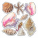Stickers in the shape of seashells with realistic sea life images. Pink conchs, spotted junonia, sea horse, starfish and others make up an interring collection of beach shells to add to scrap book pages. Or stick them on gift and favour packages, use as envelope seals, or on plain paper packaging. Choose a size.