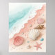 Beautiful aerial view of seashells and starfish on pink sandy beach with aqua waves. Charming coastal watercolor perfect for beach house, bathroom, nursery, or bringing beach vibes indoors.
