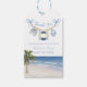 Charming baby shower thank you design featuring a watercolor clothesline with baby shorts, a bib, and a classic life ring in soft blue tones. The tropical palm tree and tranquil shoreline give this design a relaxed seaside feel, while the airy pastel palette adds a sweet and elegant touch for a baby boy celebration. Perfect for coastal, oceanfront, island, or nautical baby shower themes, this gift tag is written with varied search-friendly keywords to help attract a broader audience.