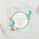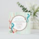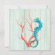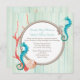 Lovely beach theme wedding invitation, done in a square shape, with a sea foam green washed out looking wood background. Graphics of turquoise sea horses, shells and coral decorate the invitation, around the rope framed text area. Personalise all the text for your beach wedding.