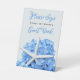 Wedding table sign for the reception. This standing plastic sign asks guests to “please sign (names) guest book” and comes in four sizes. Bold, swirling script is used for all text except the names of the bride and groom. Pale blue sign with light blue, realistic hydrangea flower with a white sea star / starfish tucked among the petals. See matching items in the Seaside Garden design line.