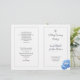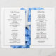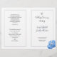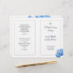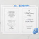 Seaside Garden folded wedding program template for a long catholic ceremony. This layered-look program contains white panels and a starfish and hydrangea design in pretty light blue - on both sides. A small image of the blue flower and sea star is in the lower corner on the front and is the background for wording inside (reverse). Each page has space for lots of text to accommodate an involved ceremony. The last page (back of program) includes a section for scripture (sample is "love is patient" from 1 Corinthians) and a message from the bride and groom.