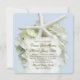 Summer wedding invitations with a white starfish and white hydrangea flowers on light blue paper. Custom and modern, square paper. "Together with their families" is the beginning line. Changing the size will cut off the text.