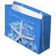 Seaside Garden, floral beach themed paper gift bag in large size. Add a custom message with names, in white script, and use this pretty floral gift bag to hold shower or wedding gifts. Don't let your text get close to edges. The blue hydrangea and starfish image is on both sides over a pretty bright blue colour.