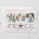 Beachy holiday photo card with a rustic flair features three square photos in a collage layout on a light wood plank background, with "peace" beneath in soft navy blue lettering. A starfish takes the place of the letter "A" for a cute coastal touch. Personalise with your names, the year, and a holiday greeting, and add an additional photo and personal message to the back if desired.