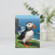 A sweet puffin postcard that has a cute illustration of a puffin sitting by the sea on an seaside dune or ledge.