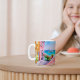 Beach life coffee mug features a seaside village of colourful 2-story homes, flower pots and views of sailboats at sunset.