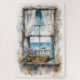 Capture the charm of coastal living with this tranquil watercolor design, featuring a weathered window framed by soft lace curtains that gently part to reveal a peaceful seaside view. A seagull rests quietly on the windowsill railing, gazing out toward calm ocean waves under a serene sky. The window box overflows with blooming lavender, ivy, and pink blossoms, adding a burst of color and life to the composition. Subtle textures in the aged wall and wooden frame enhance the rustic cottage aesthetic, while the soft, fluid brushwork evokes a dreamy, romantic feel. Perfect for those who love cozy beach houses, vintage decor, or serene nature scenes, this artwork brings a quiet coastal atmosphere into any space. Inspired by slow mornings by the sea, this design invites reflection and relaxation. AI generated artwork.