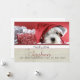 season greeting christmas pet photo cards. This Christmas photo card design is customisable with your own family name and photo! Or of course your dog. There's a christmas background, and the photo is separated from the design by a border. A fun doodle of christmas ornaments with reds and greys followed by "peace and Love" with a handwritten font feel. The rest of the text is customisable! Personalise with your own Christmas greeting or wishes, and your own family names. You can even add the date.