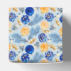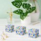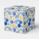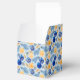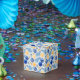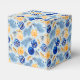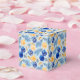 A Festive Party Favour Box In Blues and Yellows For The Holiday Season Patterned In Tree Ornaments
