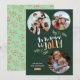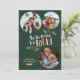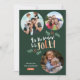 "Tis the season to be jolly" written in hand-lettered brush calligraphy on a green background + fun circle frames for your best family photos. Add your names for a personal touch. Original design by Kitty Pie Press.