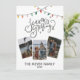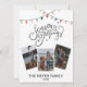 Modern, festive and cheerful Season's Greeting script calligraphy decorated with bright and colourful strings of Christmas lights on white background. Upload three of your favourite family photos and customise and personalise with year and family name to make it unique.