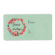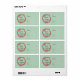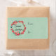 Gift labels with a pretty holiday wreath created with watercolors. Red flowers and green leaves in a circular shape with Seasons Greetings written inside in a trendy modern handwritten font. Set on a retro green background with a light linen faux texture.