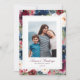 Elegant and modern winter floral "Season's Greetings" Christmas holiday card design features a horizontal photo framed by a richly coloured watercolor floral pattern with Bordeaux / burgundy red, navy blue, pink, and cream flowers with platinum grey background. The back of the card includes a second square shaped photo and additional custom text that can be personalised.