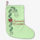Christmas stocking features an original marker illustration of a lamppost wrapped in green garland and a big red bow, with SEASON'S GREETINGS in a fun red font. Printed on a green background. Perfect for holiday decorating!