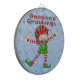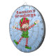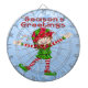 Season's Greetings Elf Dart Board features a light blue background with swirls and snowflakes, a Happy Santa's Elf wearing red and green, holding a colourful candy cane. Stylised red striped text is Season's Greetings. Perfect for Christmas Party games or as a Christmas gift! Includes 6 brass darts (3 American flag dart flights and 3 UK dart flights). Regulation size board (18” diameter, 1” thick). Finished with aluminium frame and hanging hook.