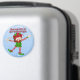 Season's Greetings Elf Round Magnet features a light blue background with swirls and snowflakes, a Happy Santa's Elf wearing red and green, holding a colourful candy cane. Stylised red striped text is Season's Greetings. Perfect gift for Christmas stocking stuffer!