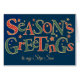 A stylish Christmas card for a Step Son, with 'Season's Greetings' in red and white and dark green and white polka dot lettering, outlined in gold-effect on a deep blue background and scattered with gold-effect and red stars. You can easily change the inside message on this text-based digital design by Judy Adamson and if you can't find a card for the person you want to send it to, there is a custom-front version you can personalise.